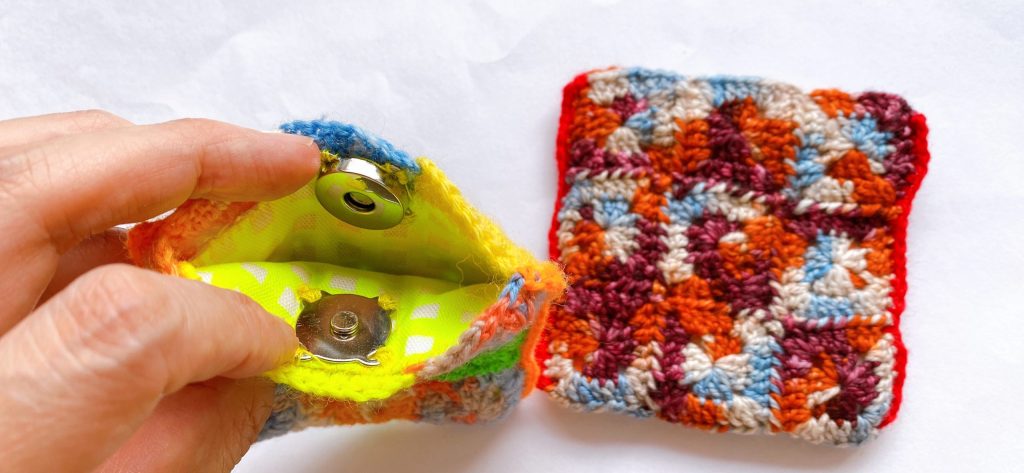 ❺裏側に縫い付けたら、マグネットボタンを付けます。
